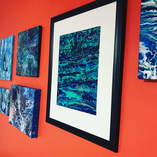 Original Acrylic Painting fluid art on canvas panel, acrylic pour, Blue stripe Framed