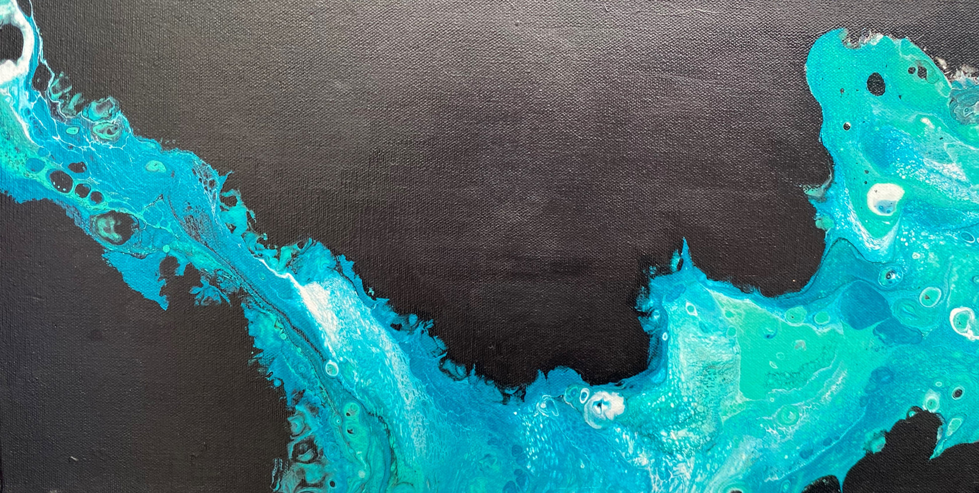 Introducing "Rivers of Light," a mesmerizing, one-of-a-kind fluid acrylic painting. This exquisite piece features a harmonious blend of deep black and vibrant aqua hues, masterfully applied using fluid acrylic techniques to create a dynamic surface.