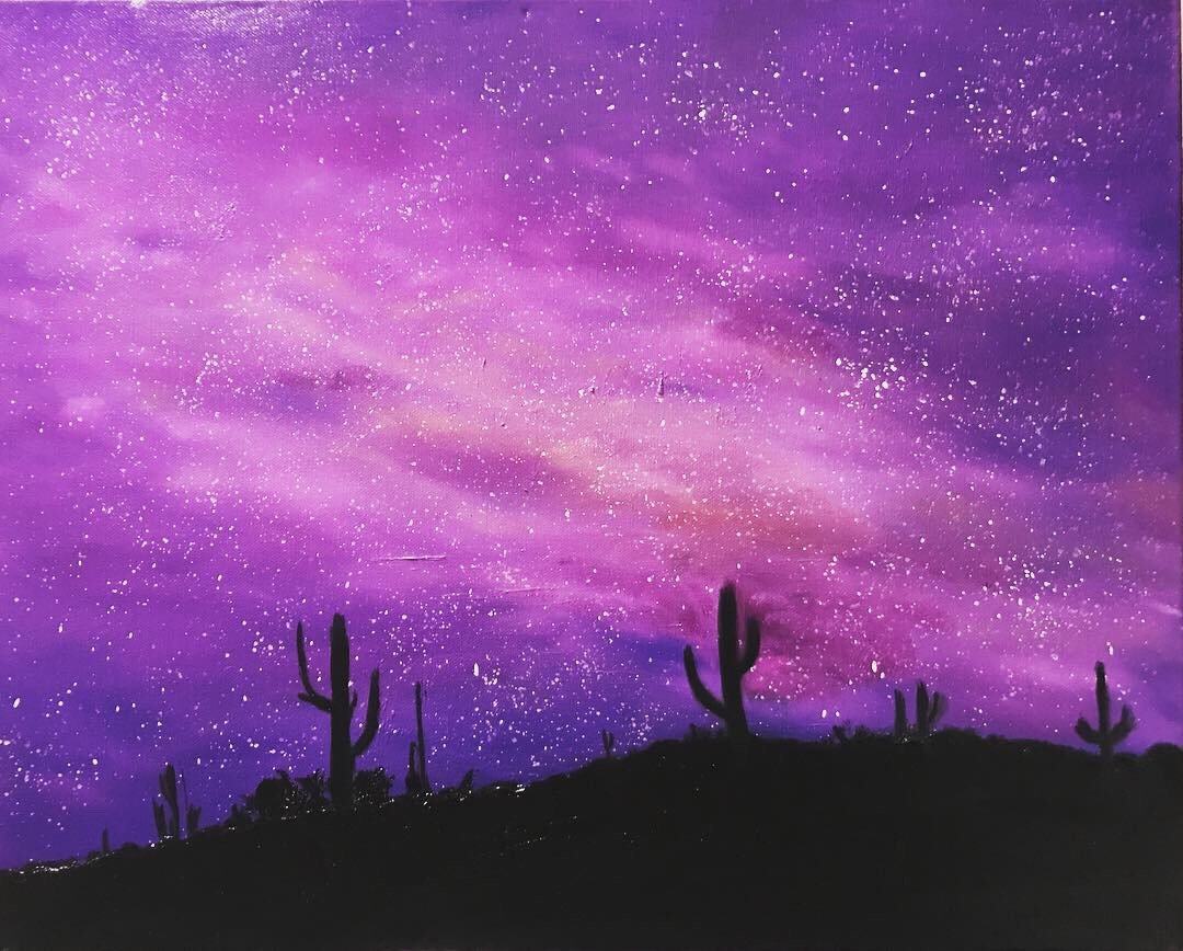 This artistic impression captures the expanse of the skyscape with countless galaxies of stars hanging right over a desert filled with cactus plants and shrubs. It is inspired by nature and brings the calmness and quiet of a beautiful desert into your personal space.